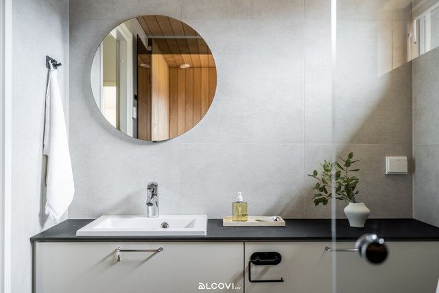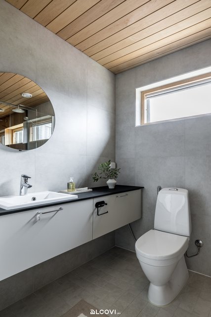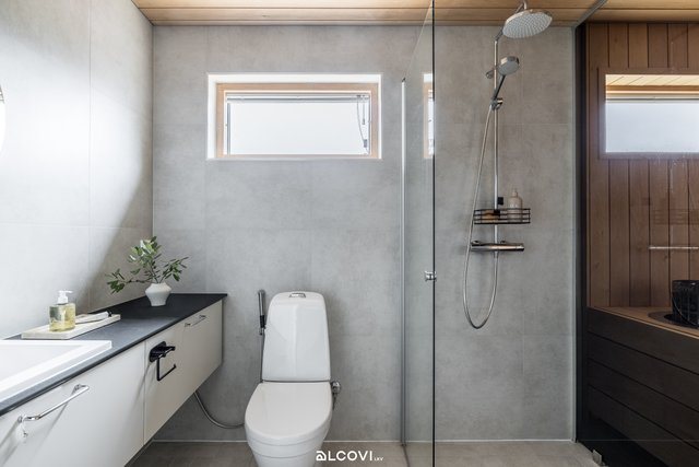 - Kylpyhuoneen varustukseen kuuluu allaskaappi (Ilona-keittiöt), pyöreä peili, suihku, lasinen kääntyvä suihkuseinä, wc-istuin ja bidee-suihku. Lattia on laattaa (Betontech 10x10, White Rect), seinät laattaa (Betontech 60x60, White Matt Rect) ja katto paneloitu (tervaleppä). Katossa upotetut led-spotit. Ikkuna ulos. Lattialämmitys (vesikiertoinen).