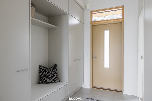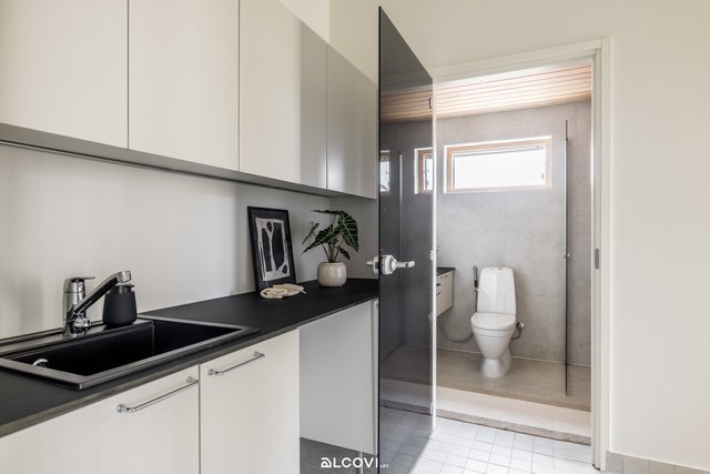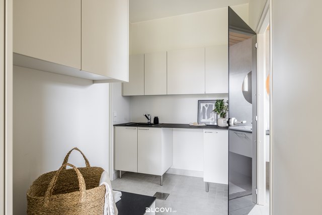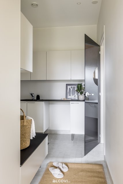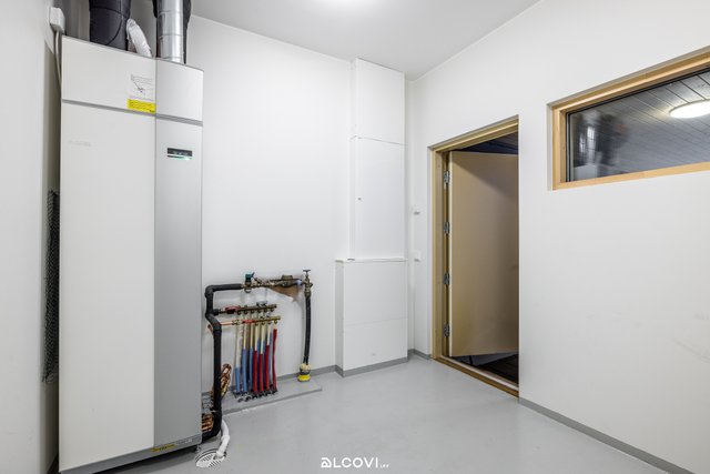 - Kodinhoitohuoneen varustukseen kuuluu kiintokaapistoa (Ilona-keittiöt), vesipiste, pyykinpesukoneliitäntä ja tilavaraus pyykinpesukoneelle. Lattia on laattaa (Betontech 10x10, White Rect), seinät maalatut. Katossa upotetut led-spotit. Lattialämmitys (vesikiertoinen).
