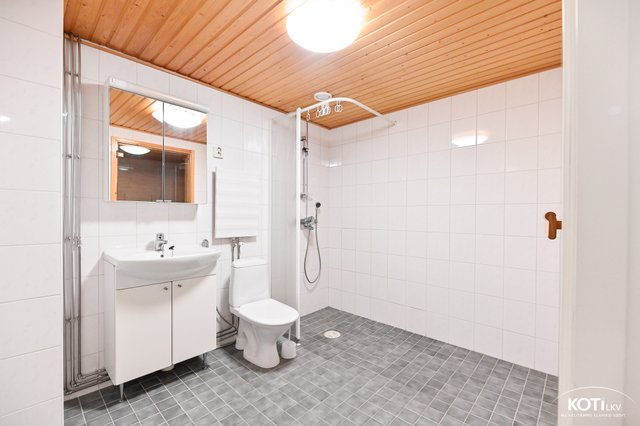 - WC-istuin, suihku, pesukoneliitäntä, lattialämmitys, peilikaappi, allaskaappi, pesuallas, ja bidee-suihku