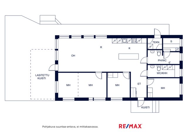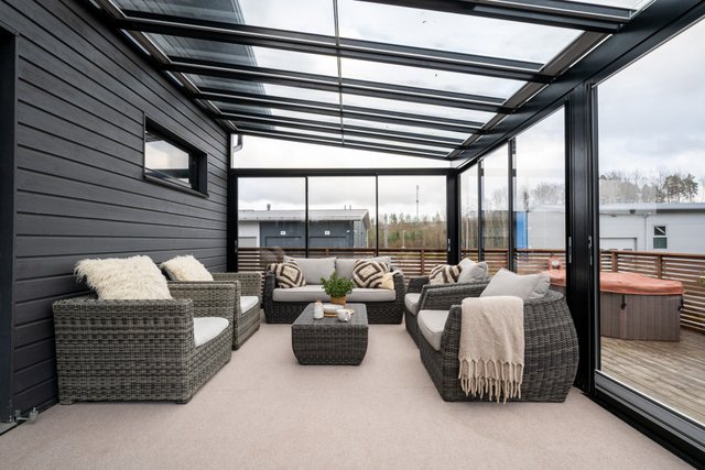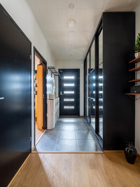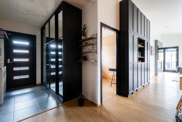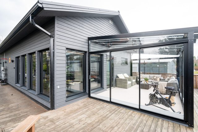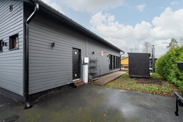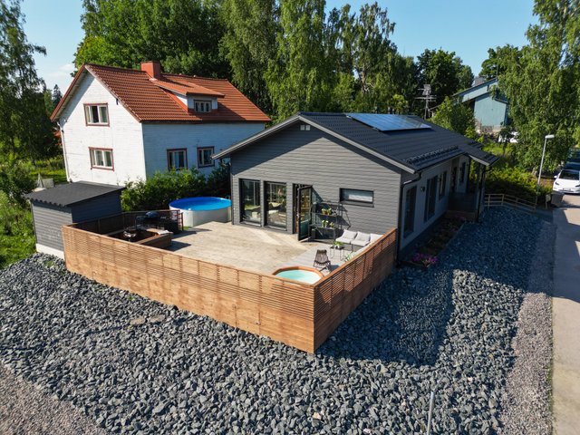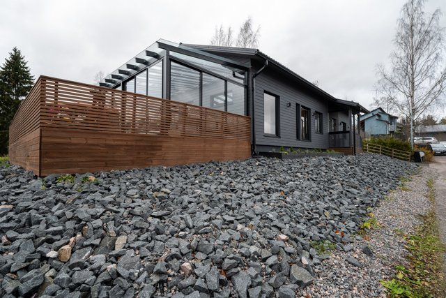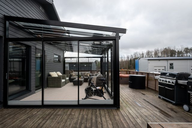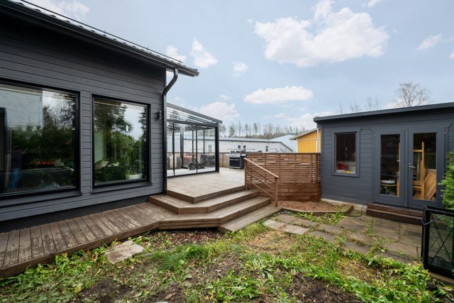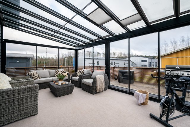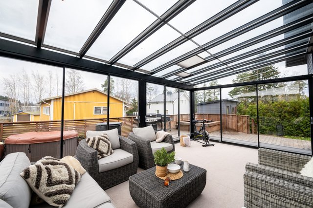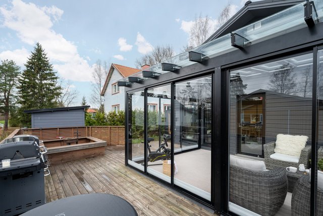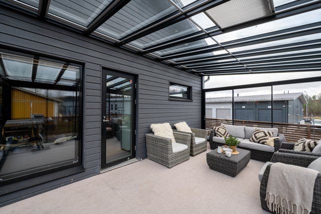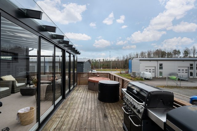 - Terassi noin 100m² ja lasikuisti noin 25m². Erillinen ulkovarasto noin 6,5m² ja tekninen tila 2,5m²