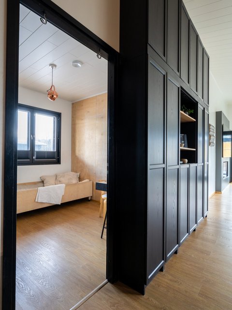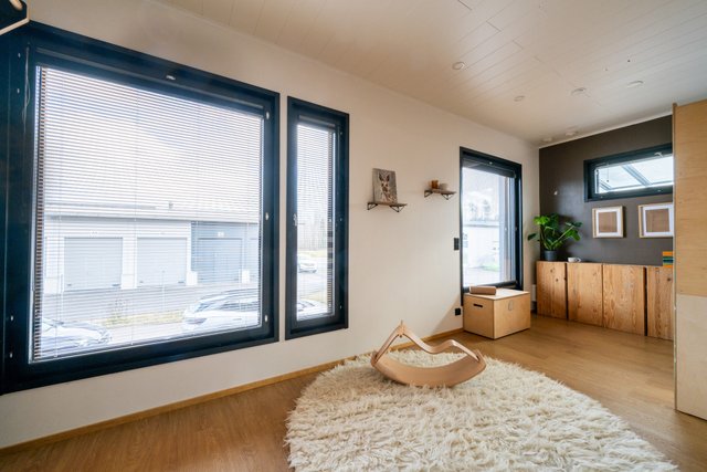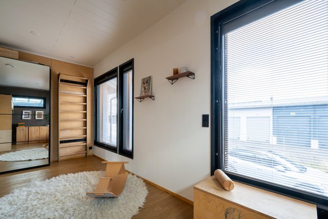 - Sisustustakka. Ikkunoissa sälekaihtimet sekä vekkikaihtimet.
