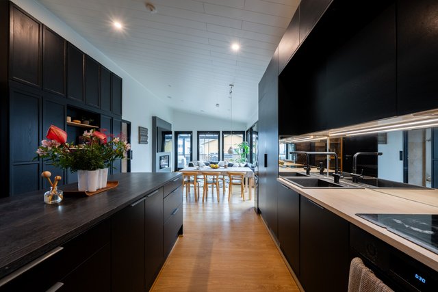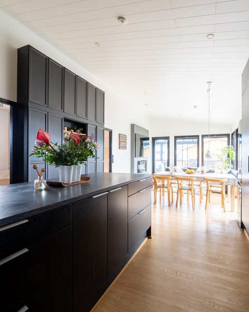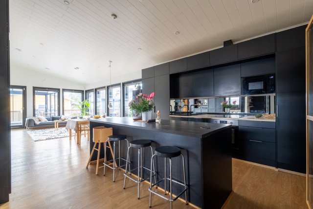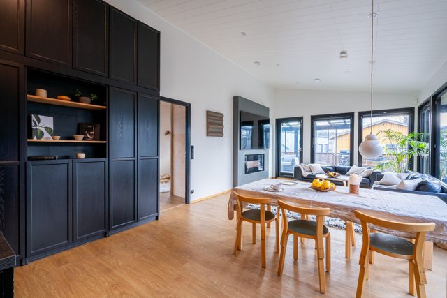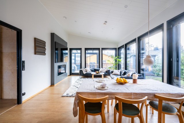 Avara oleskelutila jatkuu keittiöstä olohuoneeseen ja edelleen todella tilavalle noin 25m² lasitetulle terassille.