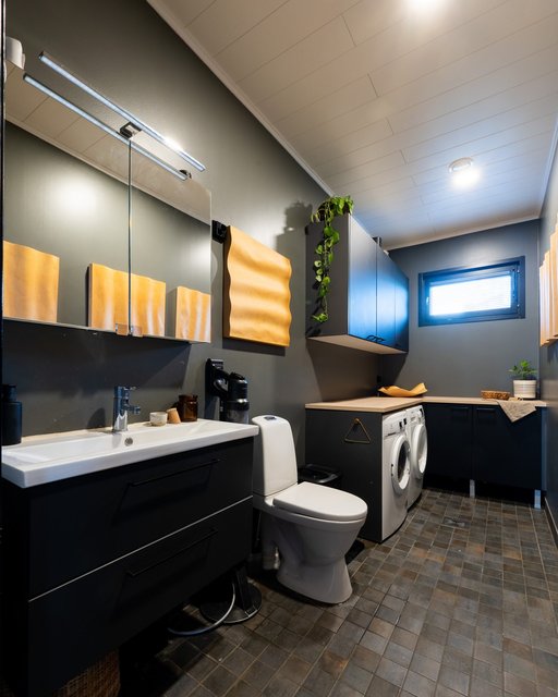 - Pesukoneliitäntä, lattialämmitys, pesuallas, lattiakaivo, pyykkikaapit, ja pöytätaso
