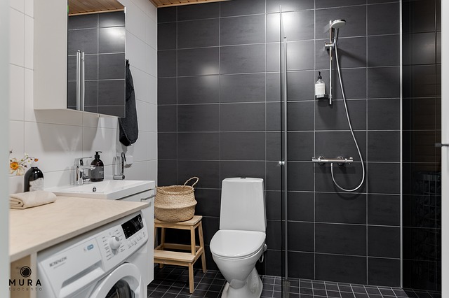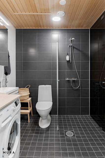 - Suihku, suihkuseinä, lattialämmitys, pesukoneliitäntä, wc-istuin, ja peilikaappi