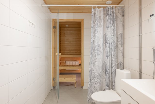 - WC-istuin, suihku, suihkuseinä, pesukoneliitäntä, lattialämmitys, peilikaappi, pesuallas, allaskaappi, ja bidee-suihku