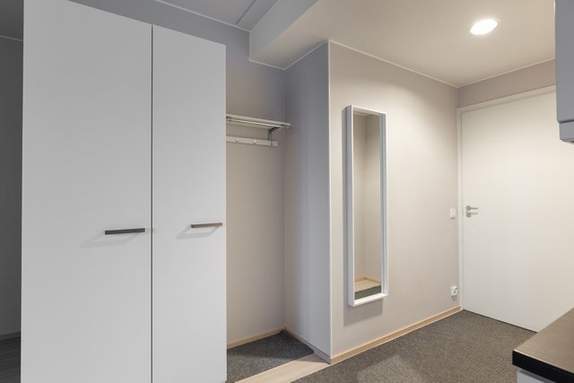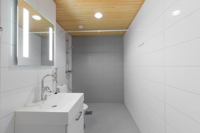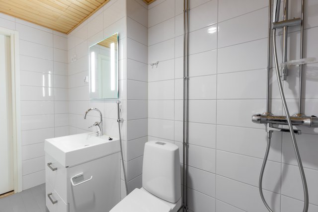 - WC-istuin, suihku, pesukoneliitäntä, lattialämmitys, peili, allaskaappi, pesuallas, ja bidee-suihku