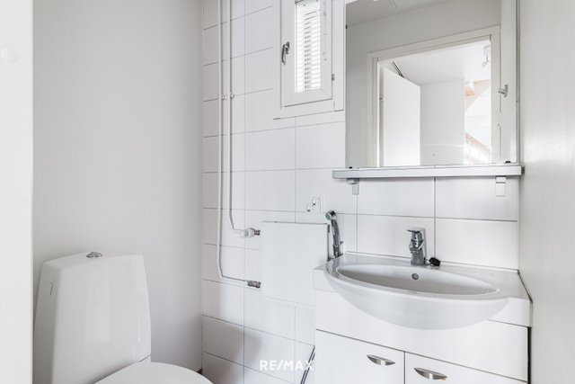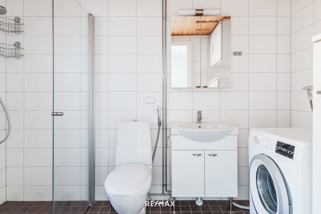 - WC-istuin, suihku, suihkuseinä, pesukoneliitäntä, lattialämmitys, peilikaappi, pesuallas, allaskaappi, ja bidee-suihku
