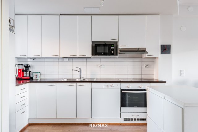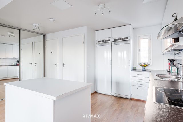 - Jääkaappi, erillinen pakastin, uuni, liesi, liesituuletin, astianpesukone, ja keittiösaareke