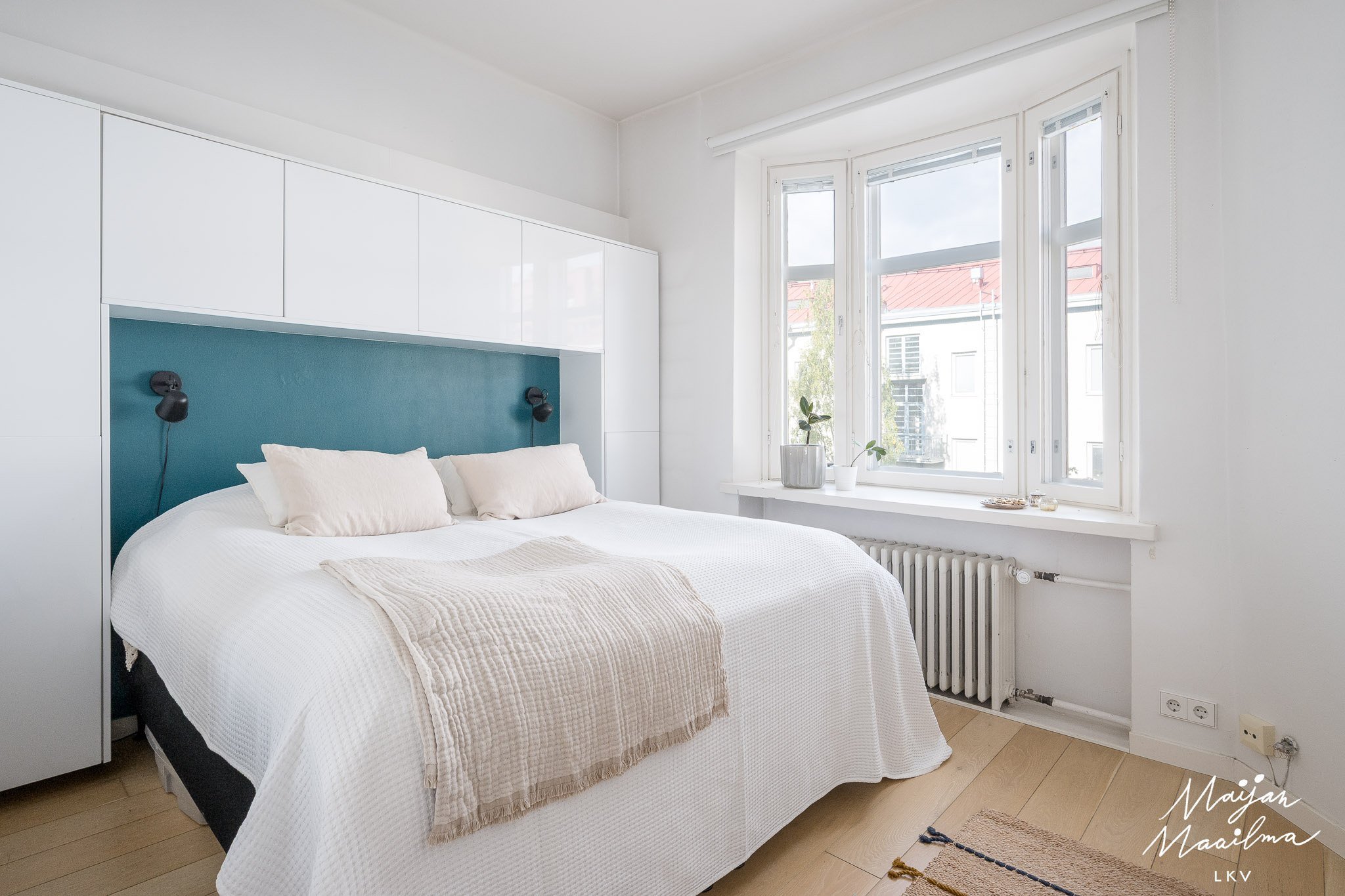 - Parkettilattia, maalatut seinät. Vaatekaapistot. Kiinteästi asennettu epäsuora valaistus.