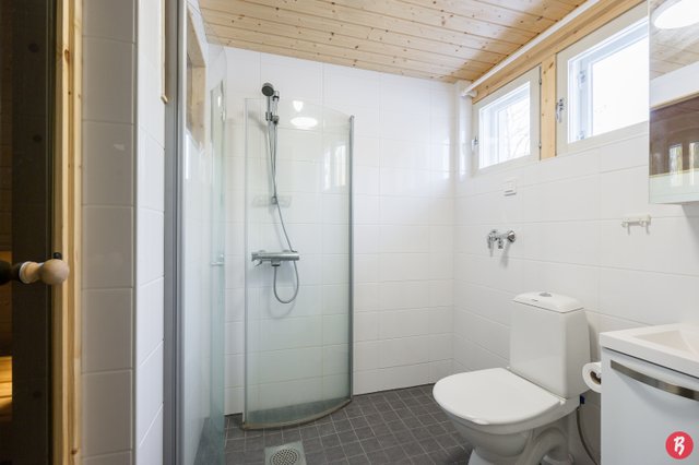 - WC-istuin, suihku, suihkuseinä, pesukoneliitäntä, allaskaappi, pesuallas, ja bidee-suihku