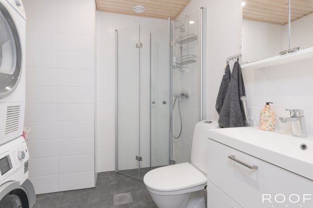 - WC-istuin, suihku, suihkuseinä, pesukoneliitäntä, lattialämmitys, peilikaappi, allaskaappi, ja bidee-suihku