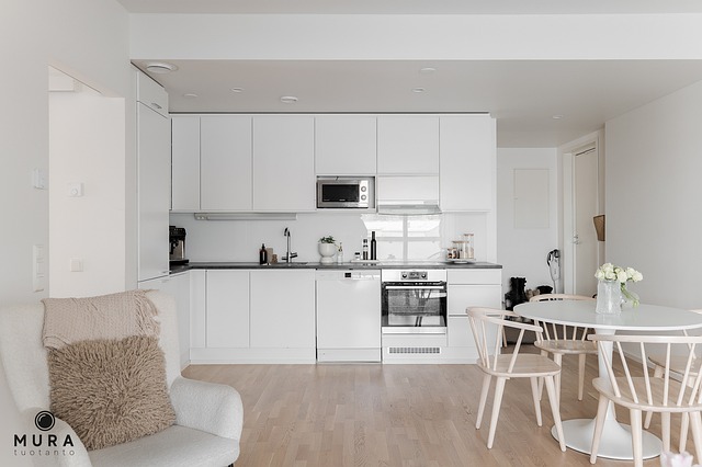 - Tyylikäs vaaleasävyinen keittiö, jossa integroitu jääkaappi/ pakastin, keraaminen liesi, erillisuuni, astianpesukone, liesituuletin.