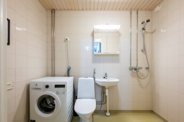 - Suihku, wc-istuin, pesukoneliitäntä, peili, peilikaappi, ja pesuallas