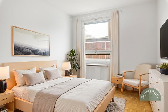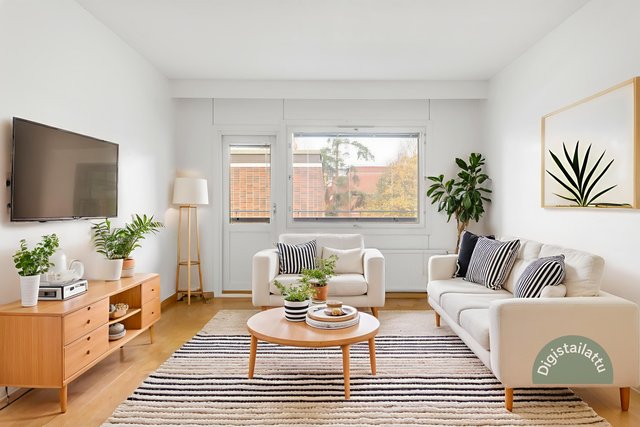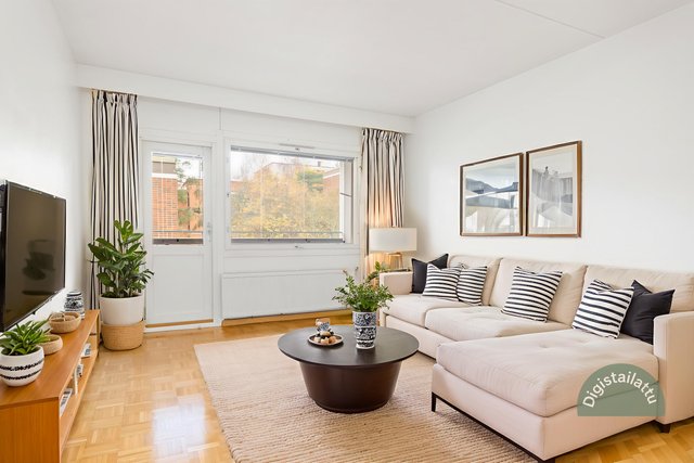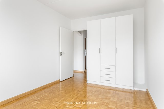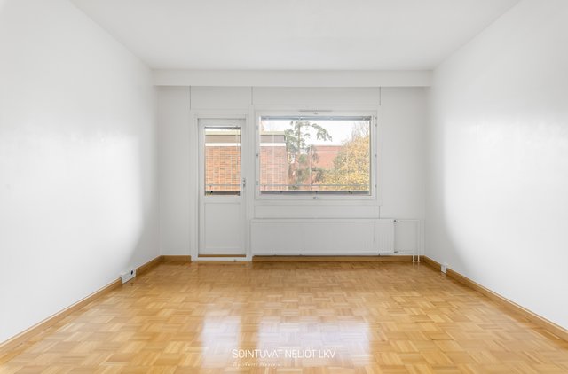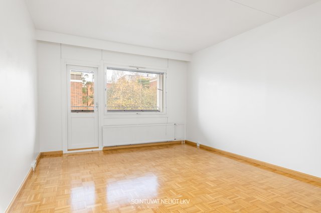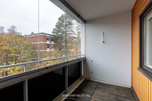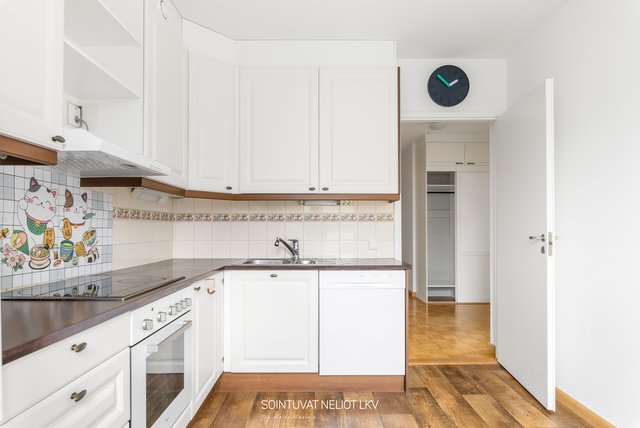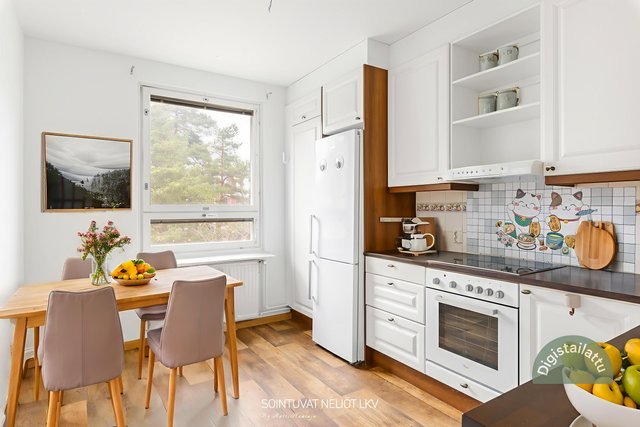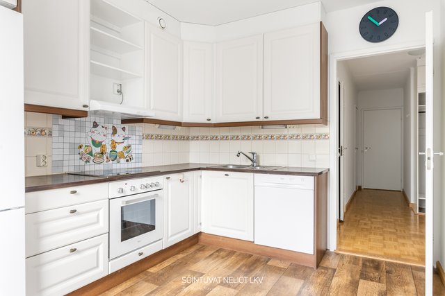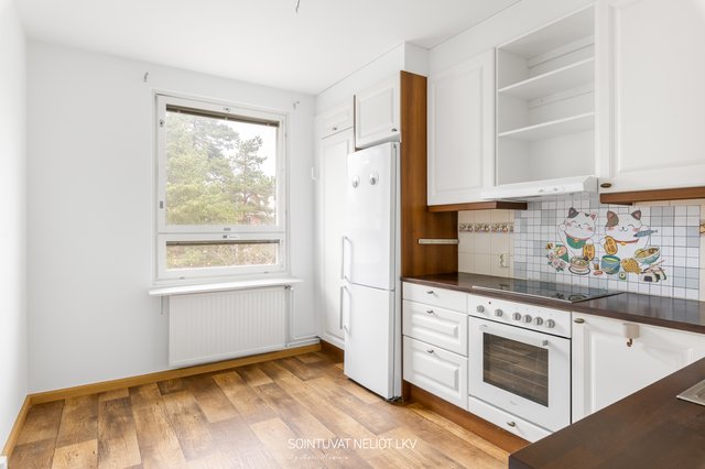 Avaran olohuoneen jatkeena on lasitettu länsiparveke rauhallisin näkymin. Siistikuntoinen keittiö on varustettu kaikilla keskeisillä kodinkoneilla, ja myös ruokapöydälle on hyvin tilaa.