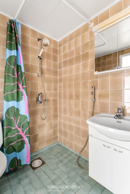 - WC-istuin, bidee-suihku, suihku, pesukoneliitäntä, pesukone, vesikiertoinen pyyhekuivain, peilikaappi (2 kpl), pesuallas, ja allaskaappi