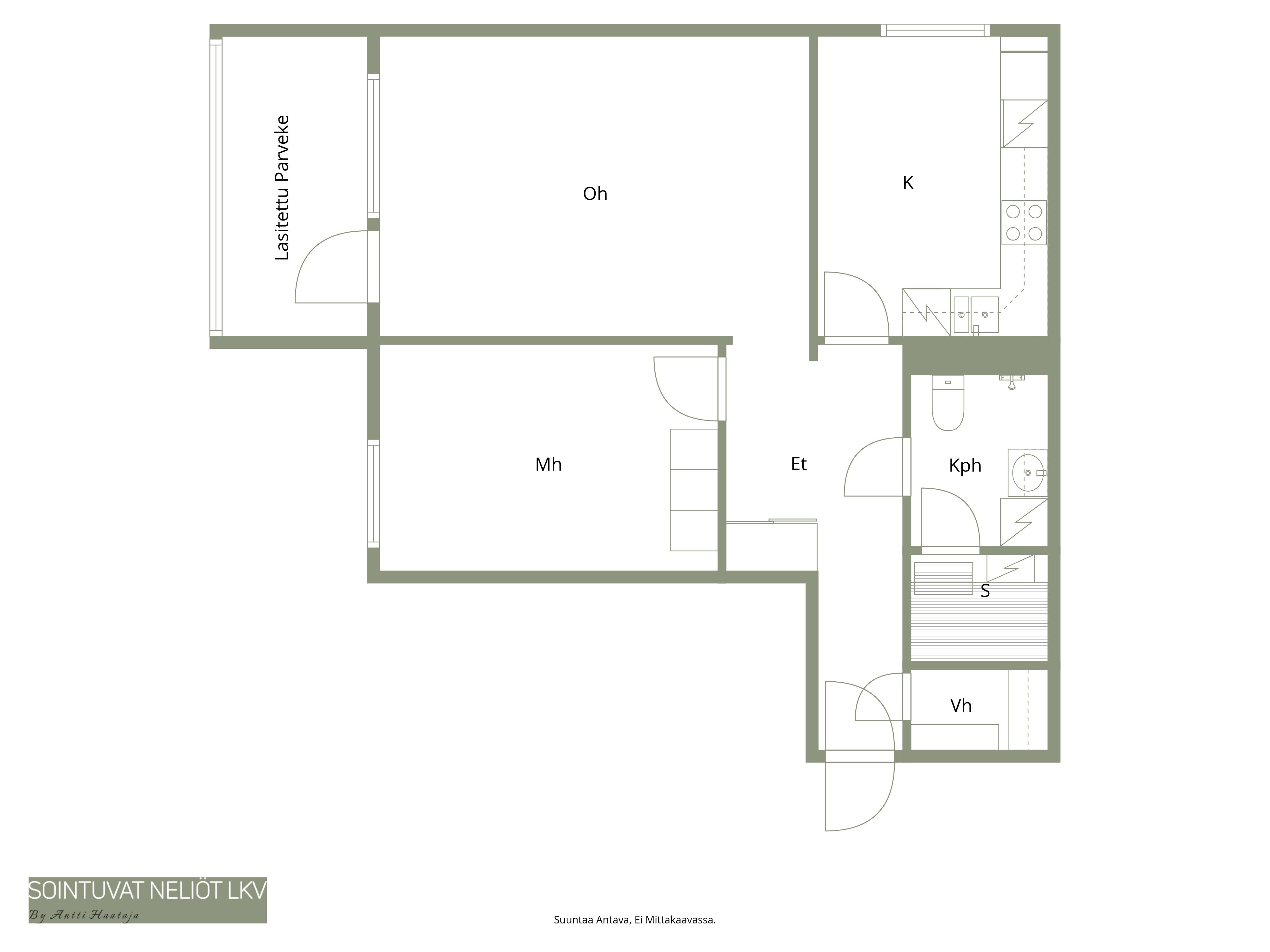 - Ei tarkistusmitattu. Pinta-alat saattavat tämän ikäisissä kohteissa (yhtiö rekisteröity ennen 01.01.1992) poiketa olennaisestikin asuinrakennusten nykyisten mittaustapojen ja standardien (SFS 5139) mukaan laskettavasta asuintilojen pinta-alasta. Pinta-ala voi siis olla edellä mainittua pienempi tai suurempi.