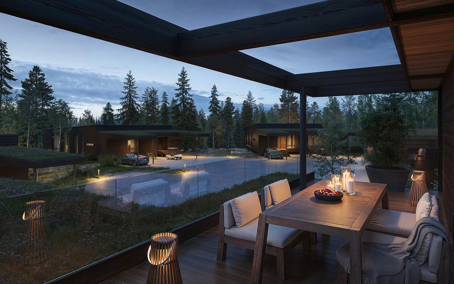 Tässä kaksikerroksisessa rivitaloasunnossa hirsipinnat ja luonnonvalo kohtaavat täydellisessä harmoniassa. Hirsipintojen sävy on valittavissa tumman ja vaalean välillä ja avarat ikkunat kehystävät ympäröivän metsän ja tuovat luonnon osaksi sisustusta.