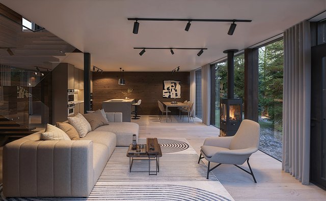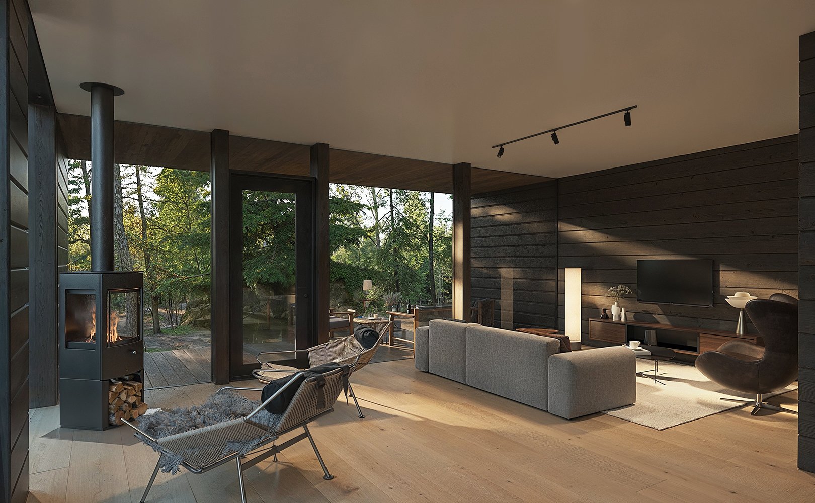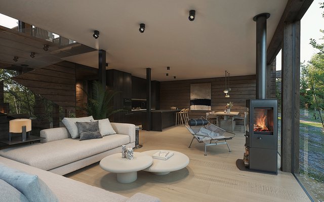 Hirsipintojen sävy on valittavissa tumman ja vaalean välillä, ja suuret ikkunapinnat tuovat luonnonvalon osaksi sisustusta.