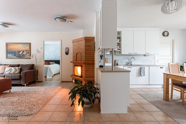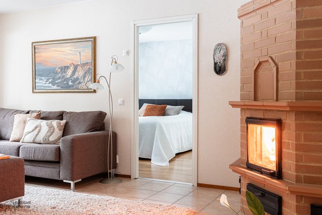 Tilava koti käsittää viisi huonetta ja keittiön, joista neljä toimii makuuhuoneina. Säilytystilaa löytyy runsaasti kaapistoista, vaatehuoneesta sekä lämpimästä varastosta. Olohuoneessa viihtyisyyttä luovat takka ja ilmalämpöpumppu, ja sieltä on käynti suojaisalle takapihalle.