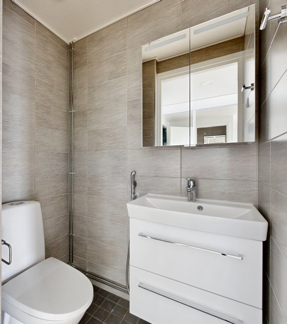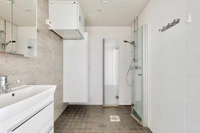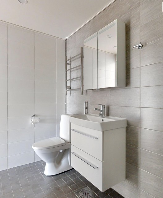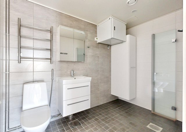- VARUSTUS: Suihku, Suihkuseinä, WC-istuin, Pesukoneliitäntä, Allaskaappi, Allas, Hana, Peilikaappi, Pyykkikaappi. Pyyhekuivain (vesikiertoinen) Lattialämmitys. SEINÄ: Laatta. LATTIA: Kaakeli.