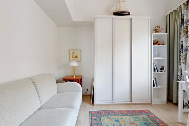 Keittiössä on valkoiset kaapistot, täysikorkeat jääkaappi ja pakastin sekä hyvin säilytys-ja laskutilaa. Kaksi makuuhuonetta, joihin huonekorkeus tuo tilantuntua. Molemmissa makuuhuoneissa ja eteisessä kaapistot. Eteisen vierestä löytyy erillinen wc ja tilava kylpyhuone.