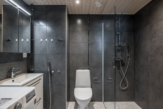 - WC-istuin, suihkuseinä, pesukoneliitäntä, allaskaappi, peilikaappi, lattialämmitys, bidee-suihku, suihku, pesuallas, ja pesukone