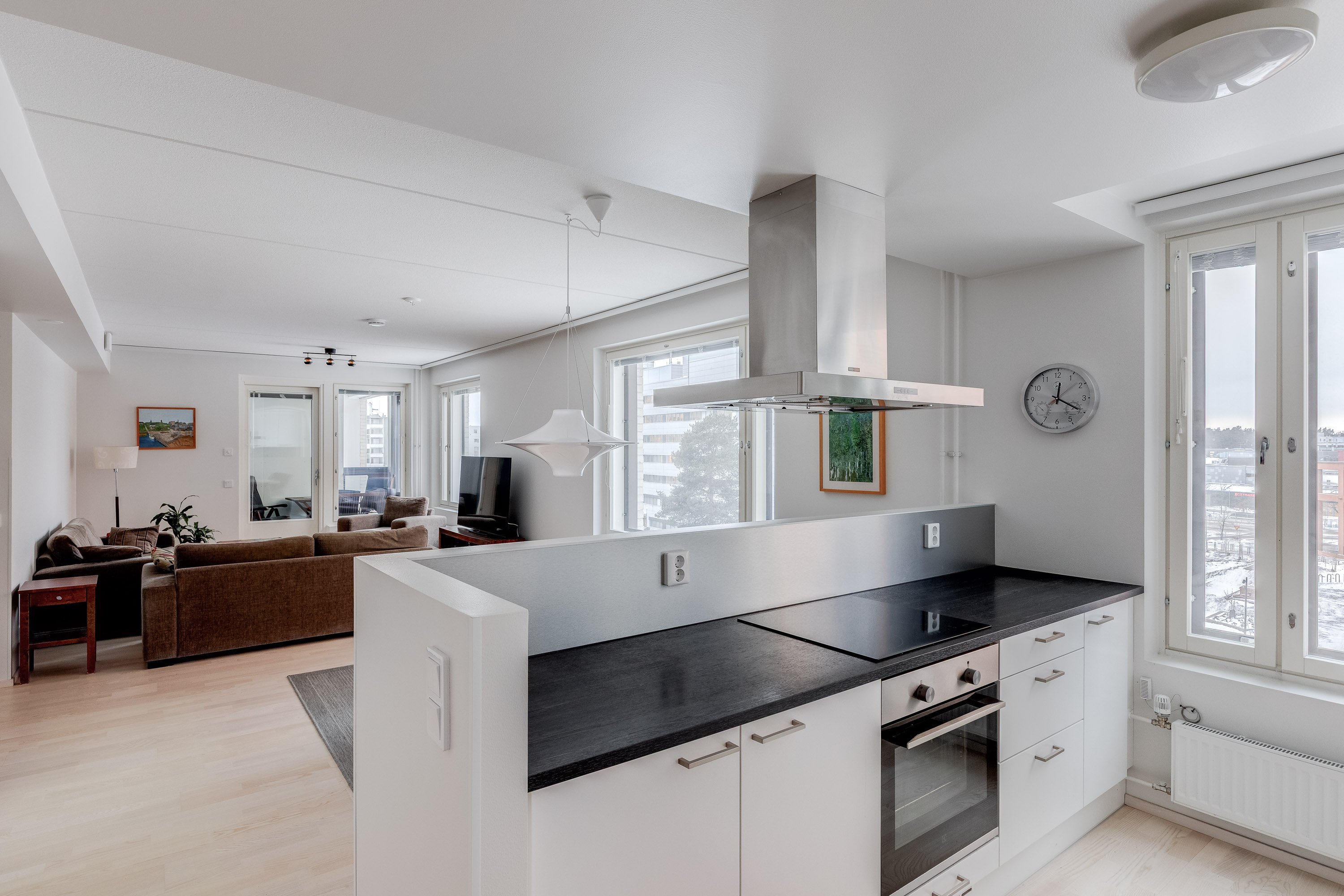 - Valkoiset kaapistot, tummat laminaattitasot, integroidut kodinkoneet (täyskorkeat jääkaappi ja pakastinkaappi, astianpesukone, mikro), induktioliesi.