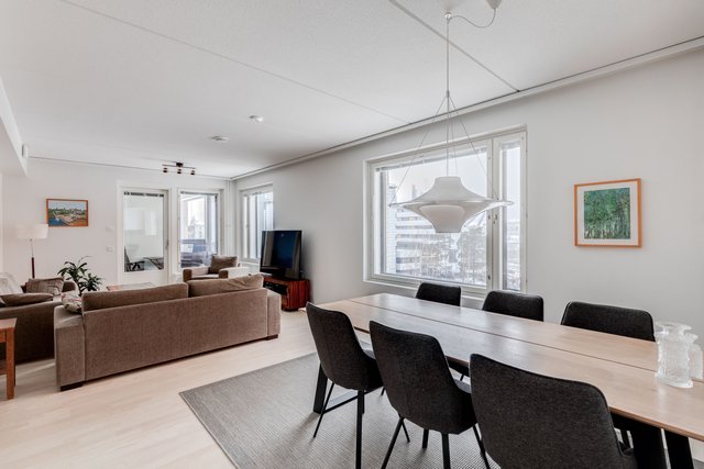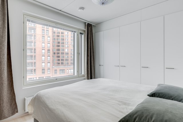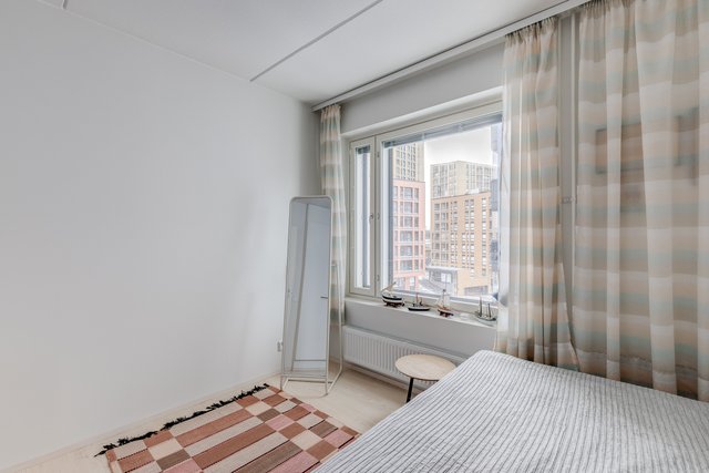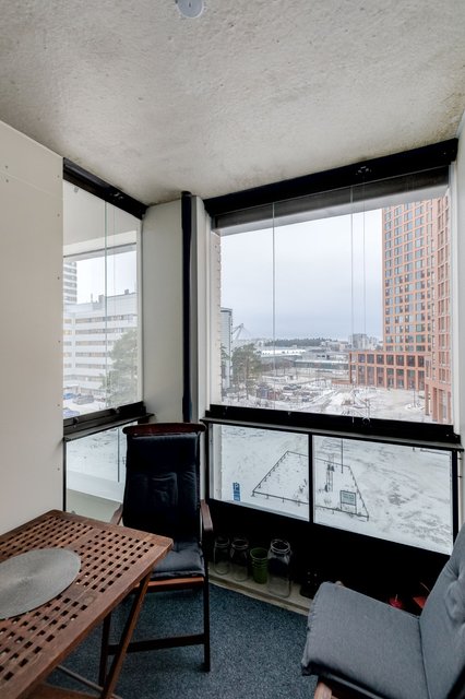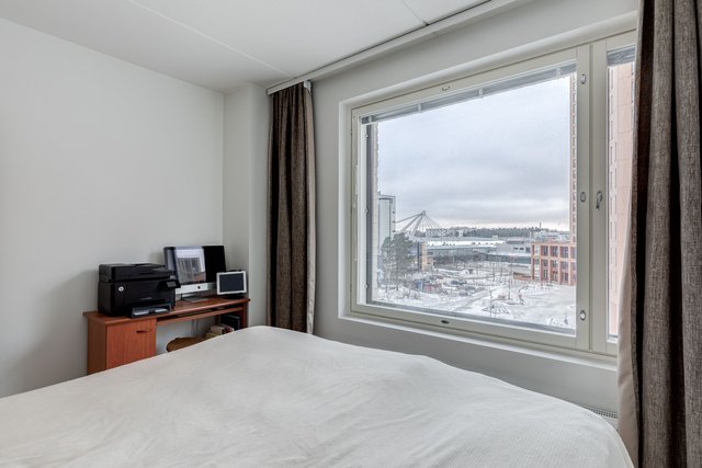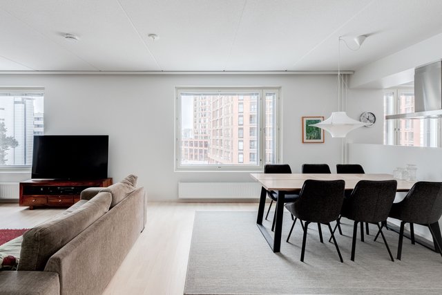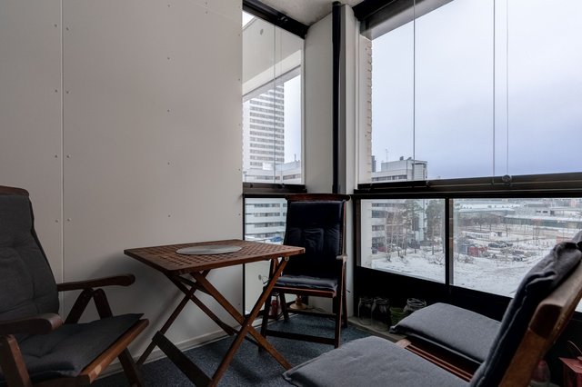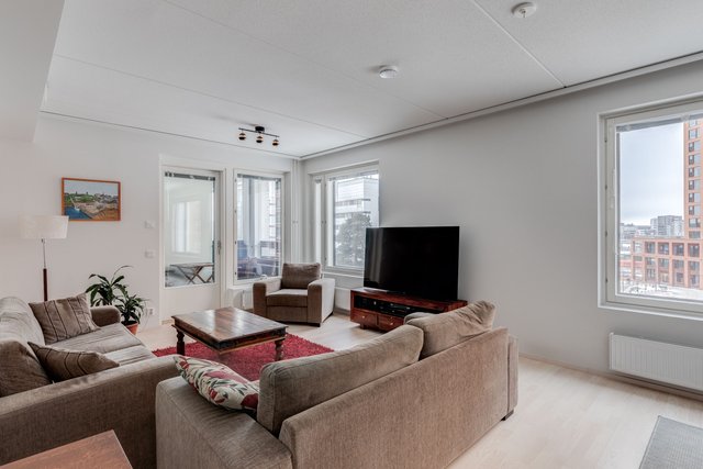 Asunto on suurten ikkunoiden ansioista valoisa ja koska ikkunat ovat pohjoisen suuntaan, ei asunto kuumene kesähelteilläkään.