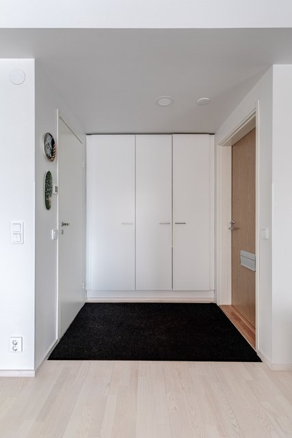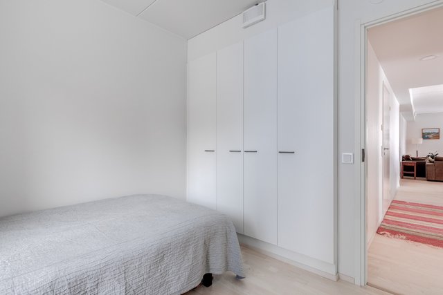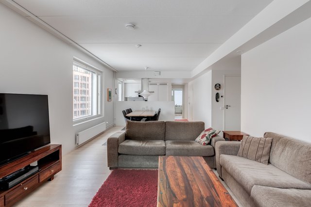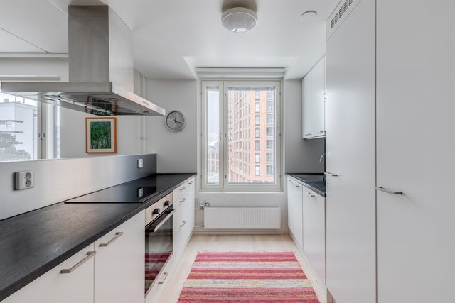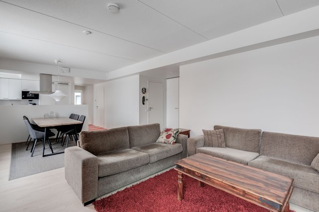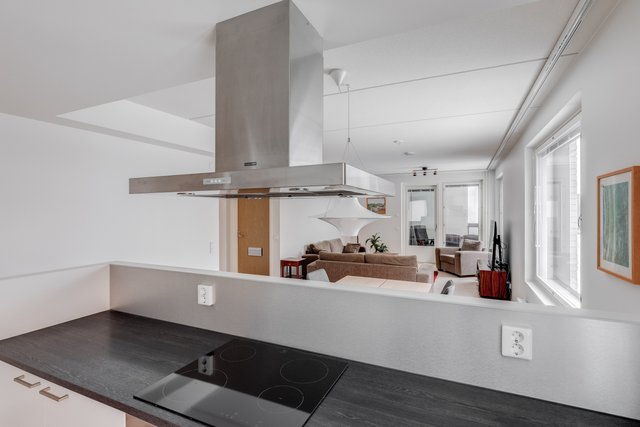 Tämän uudenveroisen huoneiston keittiö ja olohuone ovat yhtenäistä tilaa mutta kätevästi jaettu seinäkkeellä helpottaen kalustettavuutta ja tuoden näkösuojaa keittiöön. Keittiön kodinkoneet on integroitu kalusteovien taakse, mikä pitää tilan rauhallisena.