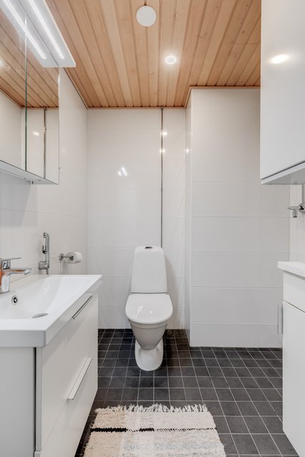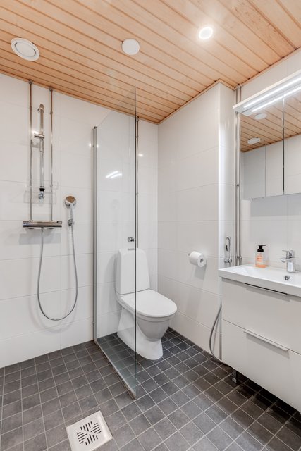 - WC-istuin, suihku, suihkuseinä, lattialämmitys, bidee-suihku, allaskaappi, peilikaappi, ja pesuallas