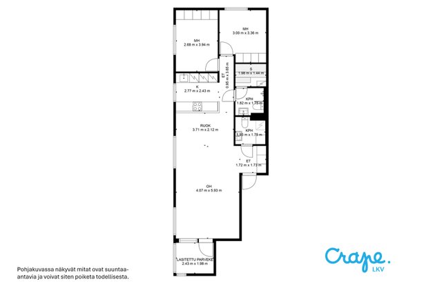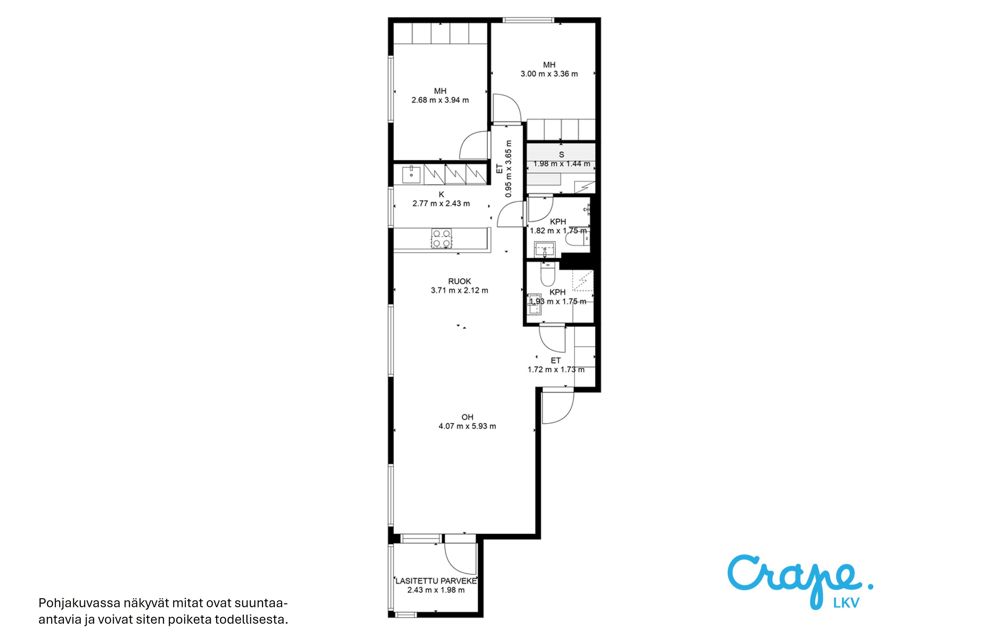 3h, avokeittiö, kph/sauna, erillinen wc, lasitettu parveke