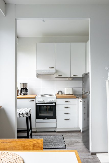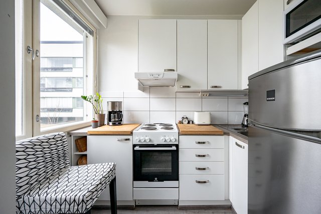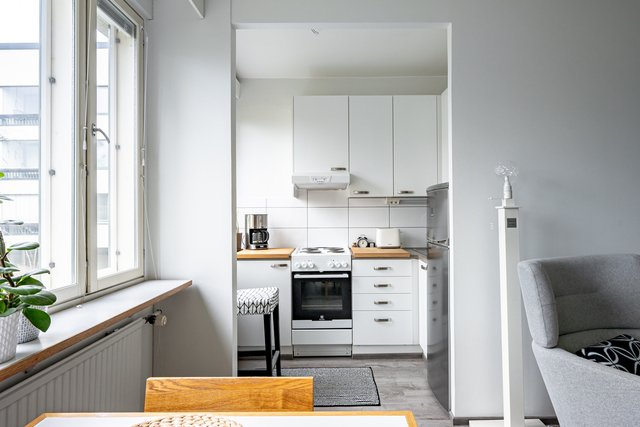 - Viehättävä vaalea keittiökomero, jossa tila myös kompaktille ruokapöydälle. Keittiömaailman Novart vuodelta 2014, varusteluna Electroluxin jääkaappi, liesi ja liesituuletin, laminaattitaso.
