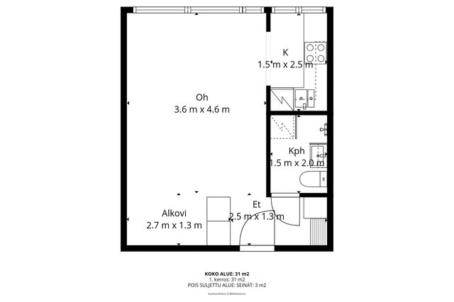 - Ei tarkistusmitattu. Pinta-alat saattavat tämän ikäisissä kohteissa (yhtiö rekisteröity ennen 01.01.1992) poiketa olennaisestikin asuinrakennusten nykyisten mittaustapojen ja standardien (SFS 5139) mukaan laskettavasta asuintilojen pinta-alasta. Pinta-ala voi siis olla edellä mainittua pienempi tai suurempi.