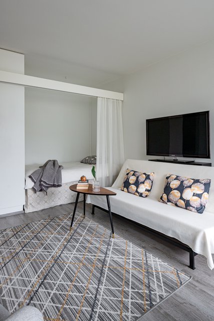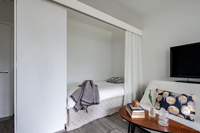 - Viehättävä oleskelutila alkovilla, johon saa sijoitettua 120cm leveän sängyn. Oleskelutilasta keskusteluyhteys keittokomeroon ja viehättävät näkymät taloyhtiön luonnonmukaiselle sisäpihalle.