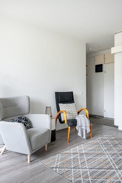 Olohuoneen alkovi tuo arkeen selkeyttä ja tarjoaa sängylle oman rauhallisen paikkansa. Moderni ja valoisa keittokomero mahdollistaa myös pienen pöydän sijoittamisen – täydellinen paikka aamukahvihetkille. Olohuoneesta avautuvat kauniit näkymät vehreälle ja luonnonmukaiselle sisäpihalle, mikä lisää asumisrauhaa. Asunto sijaitsee ensimmäisessä kerroksessa, yhden kerroksen sisääntulotasoa ylempänä.