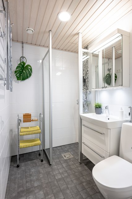- Tyylikäs kylpyhuone, joka on uusittu putkiremontin yhteydessä. Laatoitettu seinä ja laattalaattia, lattialämmitys (sähkö). Varusteluna suihkuseinä, peilikaappi, käsienpesuallas, allaskaapisto, pesukoneliitäntä, rättipatteri, wc-istuin.