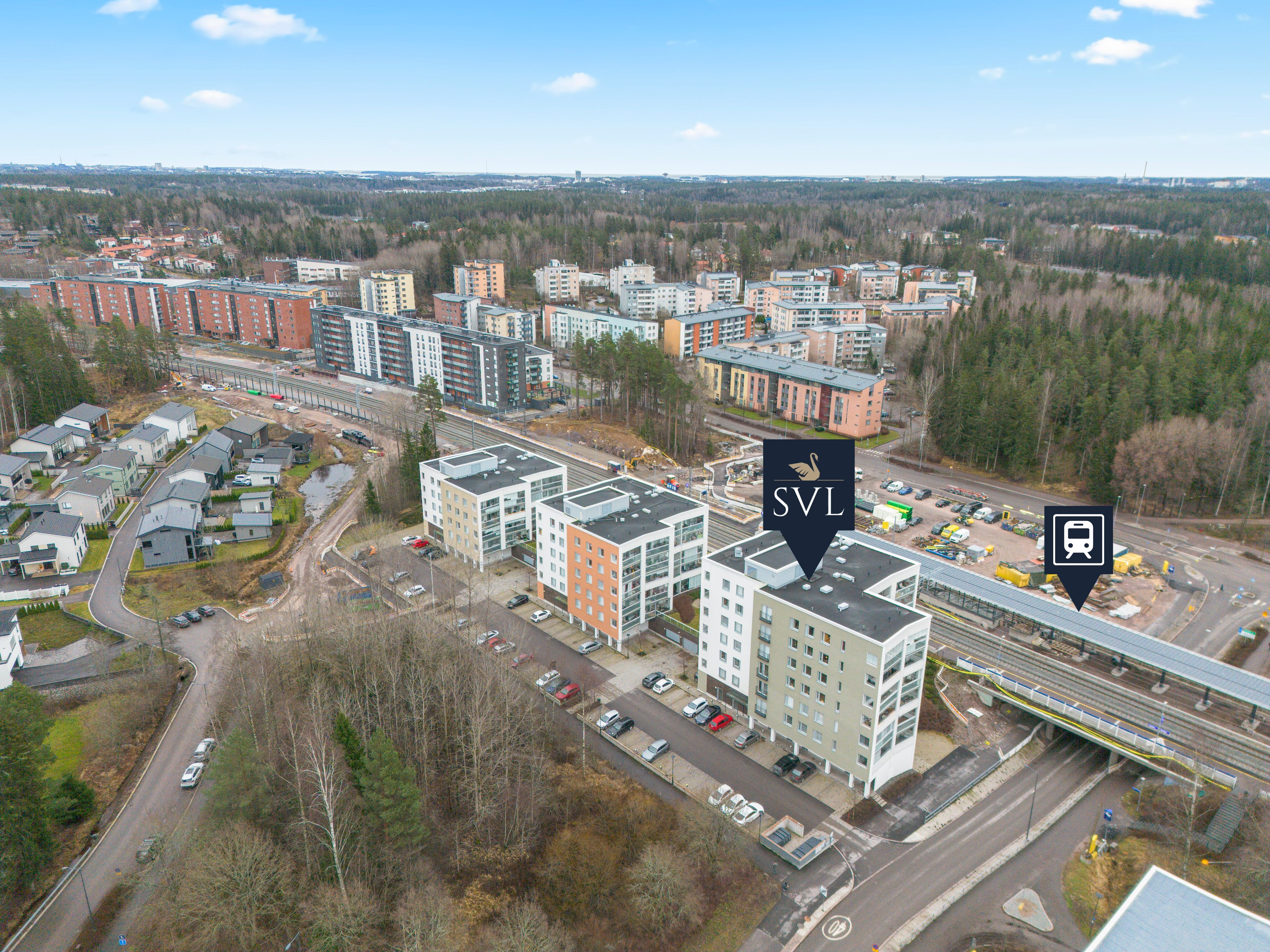 Kodin sijainti on erinomainen: palvelut, koulut, päiväkodit ja loistavat liikenneyhteydet ovat kaikki kävelyetäisyydellä. Kauniaisten vehreät ulkoilureitit alkavat lähes kotiovelta.