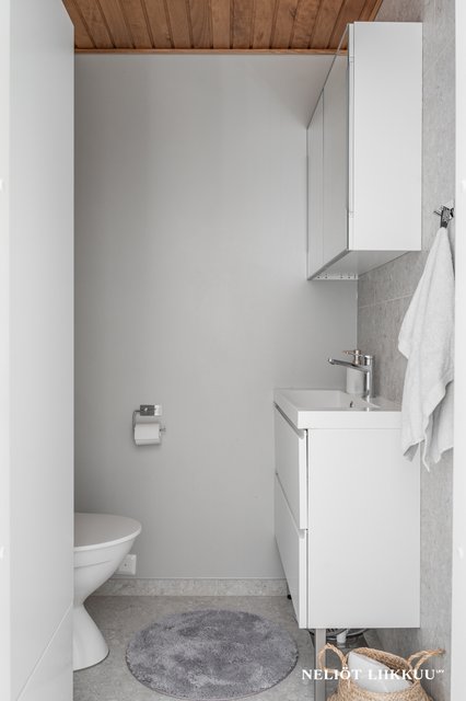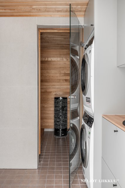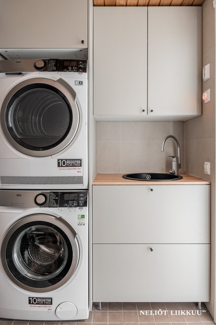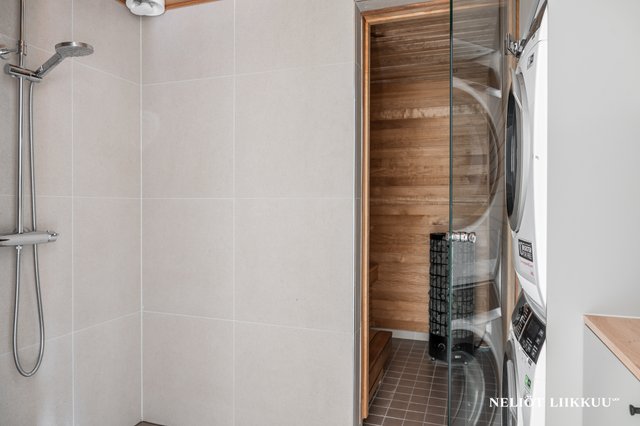 - Suihku, pesukoneliitäntä, lattialämmitys, pesuallas, ja allaskaappi/ laatikosto