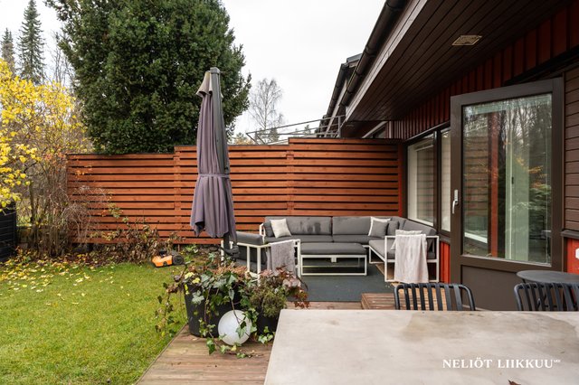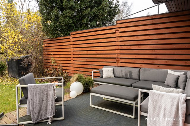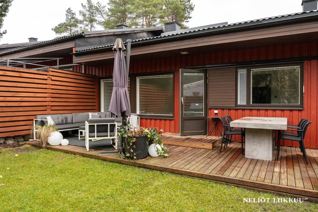 Kodin materiaalit ja yksityiskohdat on valittu huolella: Charmian keittiö integroiduilla kodinkoneilla, moderni kylpyhuone ja kätevä kodinhoitotila, oma sauna sekä uusittu, viihtyisä terassialue. Takapihalle tehty nurmialue ja olohuoneen vehreät, puistomaiset näkymät tekevät arjesta levollista. Lähivuosille ei ole tehty päätöksiä isommista remonteista yhtiössä.