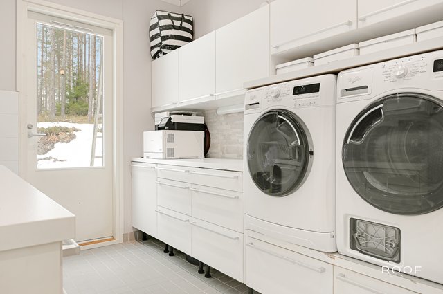 - Pesukoneliitäntä, lattialämmitys, pesuallas, lattiakaivo, pöytätaso, ja tila pesutornille (Vierekkäin)
