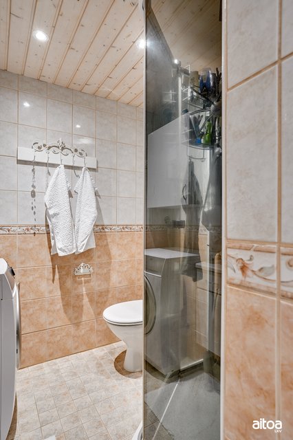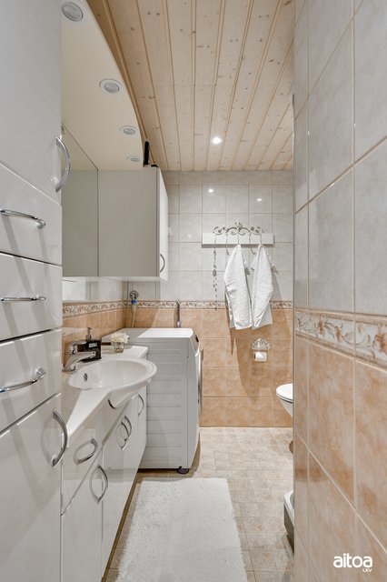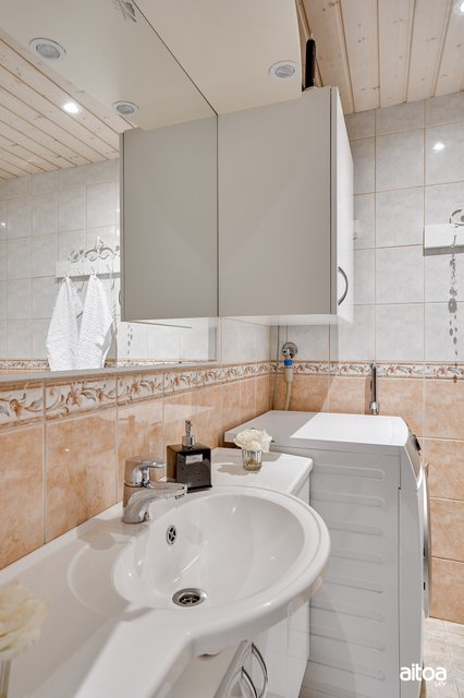 - WC-istuin, pesukoneliitäntä, suihku, suihkukaappi, lattialämmitys, bidee-suihku, pesuallas, allaskaappi, peili, ja kaapistot (uusittu 2020)