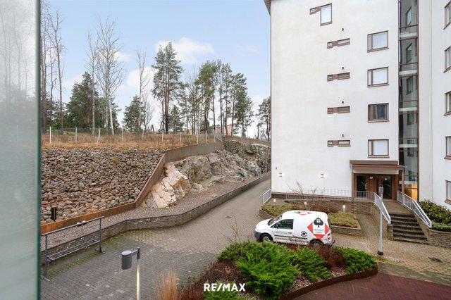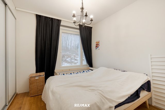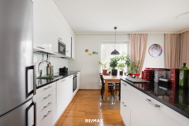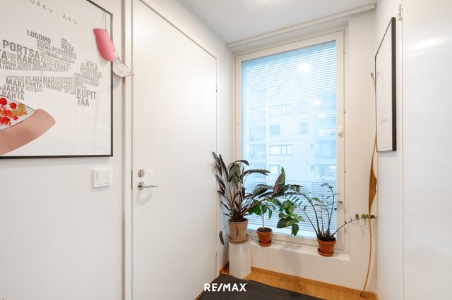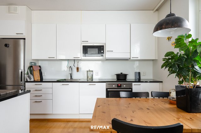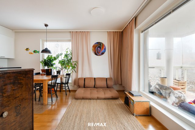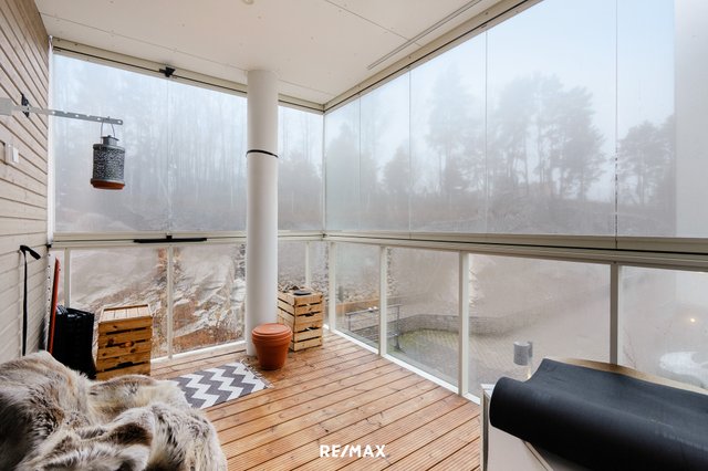 Tässä kolmannen kerroksen 54,5m2 huoneistossa on yhdistetty keittiö ja olohuone josta kulku isolle lasitetulle parvekkeelle, makuuhuone, pesuhuone/wc ja sauna.