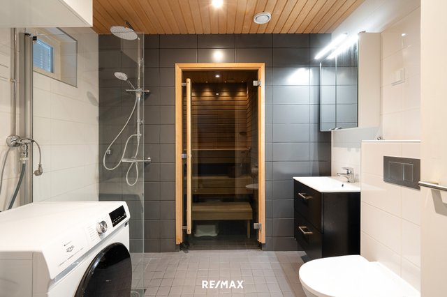 - Allaskaappi, lattialämmitys, wc-istuin, suihku, suihkuseinä, pesukoneliitäntä, pesuallas, ja peilikaappi