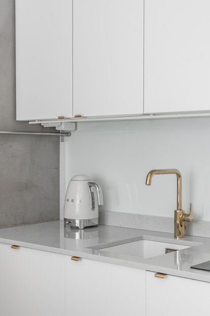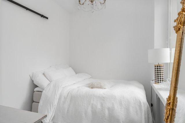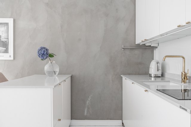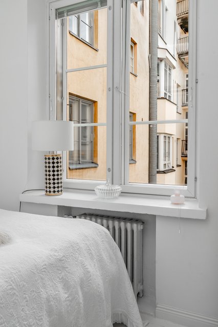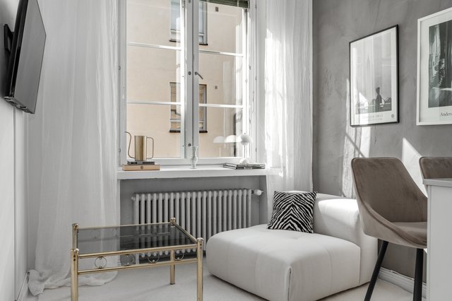 Makuuhuoneessa on kaappitilaa ja ikkuna sisäpihalle. Olohuone jatkuu keittiöstä luontevasti, ja iso ikkuna tuo tilaan valoa. Keittiö on moderni, ja sen yhteydessä on saareke, joka toimii sekä lasku- että ruokailutilana. Kylpyhuone on remontoitu hillityin sävyin ja on käytännöllisen kokoinen.