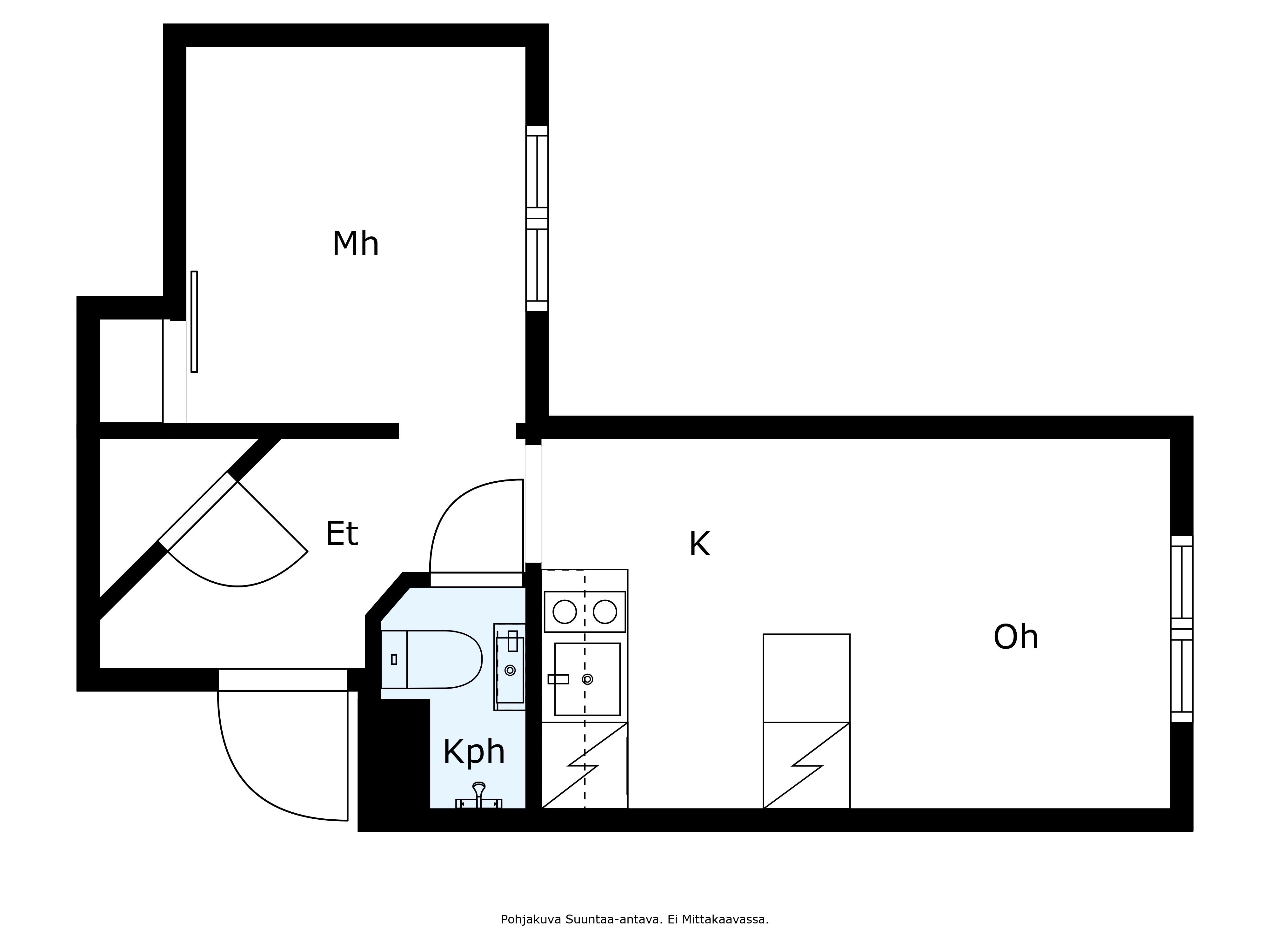 Tämä 26 m kokoinen kaksio on todellinen tilaihme, jossa jokainen neliö on hyödynnetty harkitusti. Pohjaratkaisu on selkeä ja toimiva: eteisestä on käynti kylpyhuoneeseen sekä makuuhuoneeseen, ja keittiö avautuu olohuoneeseen muodostaen yhtenäisen, viihtyisän tilan.
