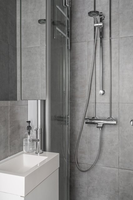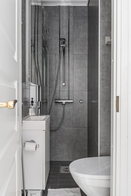 - VARUSTUS: Suihku, lasinen suihkuseinä, wc-istuin, hana, pesuallas, peilikaappi, allaskaluste SEINÄT / LATTIA: Laatta.