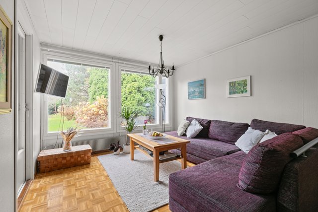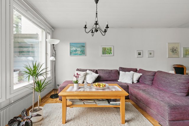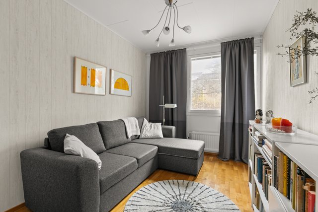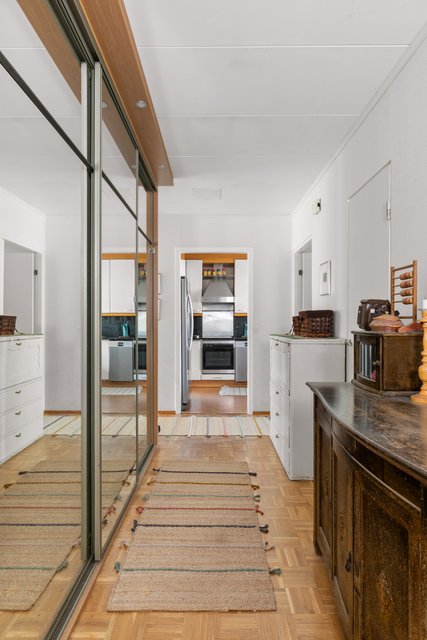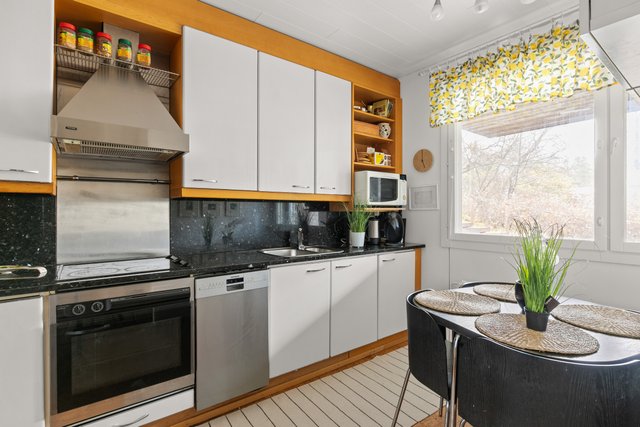 Asunnossa on kolme makuuhuonetta, joista yksi toimii tällä hetkellä kirjastona ja työhuoneena. Olohuoneen suuret ikkunat tuovat runsaasti luonnonvaloa sisään ja tarjoavat näkymät kauniille takapihalle. Olohuoneeseen mahtuu isokin ruokailuryhmä. Keittiössä on paljon kaappitilaa ja työtasot Ylämaan labradoriittia. Kylpyhuone on uusittu vuonna 2014, ja siellä on lattialämmitys. Säilytystilaa on runsaasti. Sisäänkäynnin yhteydessä on myös ulkovarasto.