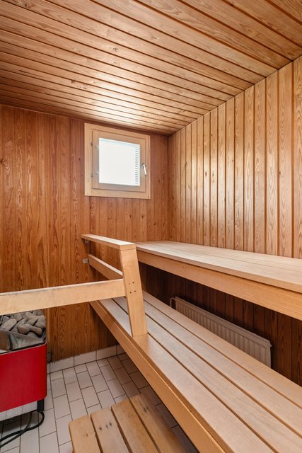 - Ikkunallinen sauna, jossa sähkökiuas. Lasinen saunan ovi 2014.