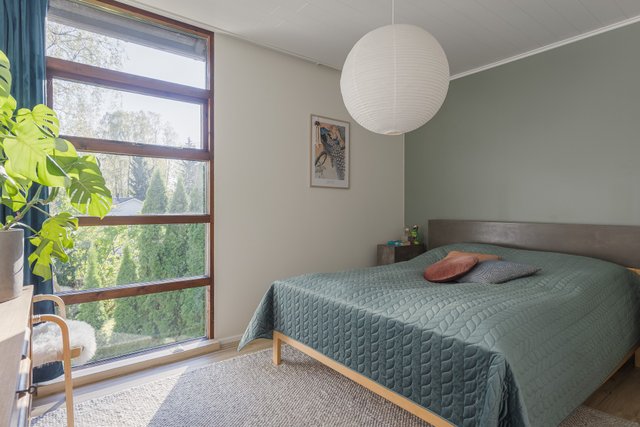 - Huoneiston makuuhuoneet sijaitsevat yläkerrassa. Molemmat huoneet ovat tilavia ja valoisia, tarjoten joustavasti tilaa esimerkiksi useamman lapsen huoneeksi, työpisteelle tai vierashuoneeksi. Ensimmäisessä makuuhuoneessa on suuret ikkunat, jotka tuovat runsaasti luonnonvaloa ja tekevät huoneesta erityisen viihtyisän. Toisessa makuuhuoneessa on tyylikäs Inarian liukuovikaapisto, joka tarjoaa runsaasti säilytystilaa. Molemmissa makuuhuoneissa on maalatut seinät ja lämminsävyinen vinyylilattia, joka luo yhtenäisen ja kodikkaan tunnelman koko yläkertaan. Tilanjako on helposti muunneltavissa, ja tarvittaessa on myös mahdollisuus lisämakuuhuoneen rakentamiseen.