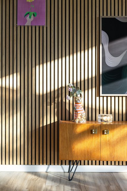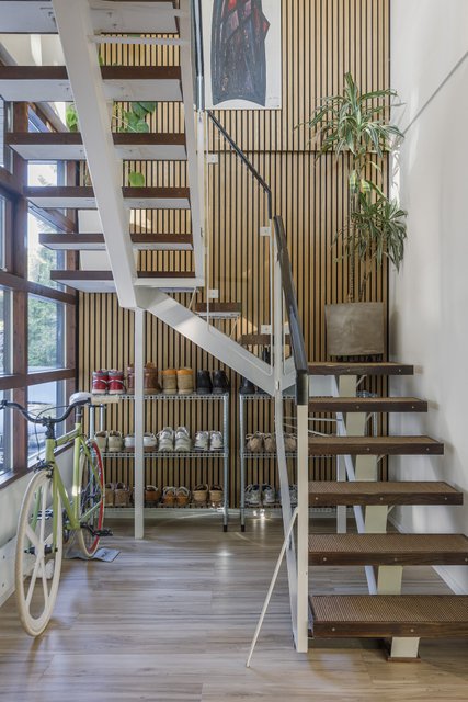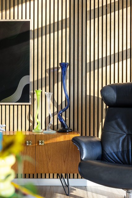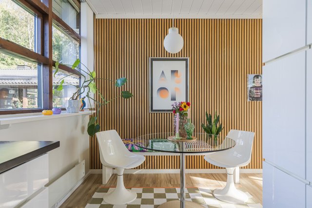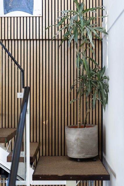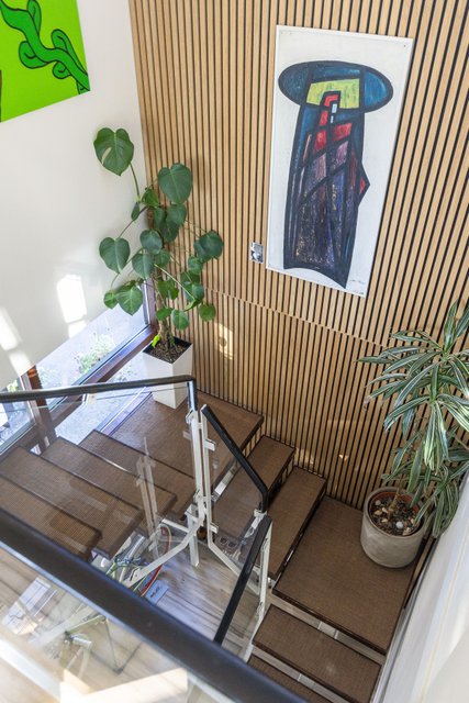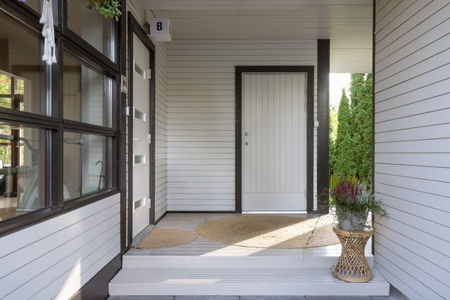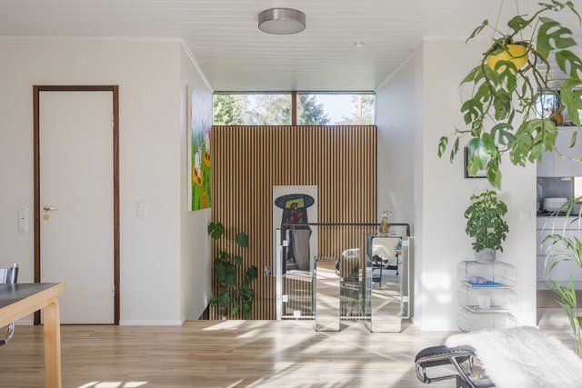- Eteinen toivottaa tulijan tervetulleeksi avaruudellaan ja valoisuudellaan. Tilaa korostavat isot ikkunat, kauniit kaapistot ja lämminsävyinen vinyylilattia, jotka luovat harmonisen ensivaikutelman kodista. Kodikas takkahuone alakerrassa kutsuu rentoutumaan. Seinän tammiviilu-akustiikkapaneeli ja käynti omalle pihalle tuovat tilaan lämpöä ja luonnonläheistä tunnelmaa. Tilaa täydentää ilmalämpöpumppu, joka lisää asumismukavuutta ympäri vuoden. Portaikossa yhdistyvät tyyli ja toimivuus: sisalmatto tuo pehmeyttä ja turvallisuutta askellukseen, kun taas akustiikkapaneelilla viimeistelty seinä lisää kodikkuutta ja antaa tilalle elegantin ilmeen.